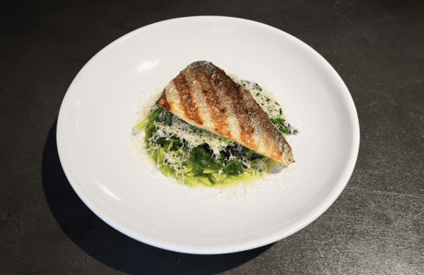 Філе дорадо, шпинат, паста орзо, соус песто, олія, сир пармезан, сіль